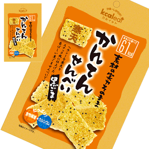 更に美味しくなってリニューアルしました!TV・雑誌で話題の!!え?っ?これが『かんてん』お試し1袋 かんてんせんべい【黒ゴマ味】 15g価格: 158円レビュー評価: 4.64 レビュー数:11 えっ??これが『かんてん』1袋まるごと食べても約61キロカロリー【寒天せいべい 黒ゴマ味】は、海藻の天草(テングサ)を煮出し、凍結・乾燥させて作られた「寒天」を主成分に「ゴマ」を加え食べやすいスナック風に仕上げたお菓子です。原料が海藻ですのでカロリーがほとんどありません。お菓子は食べたいけど、カロリーがちょっと・・・という方におすすめです。【栄養成分】(15gあたり)・エネルギー61Kcal、たんぱく質0.2g、脂質2.6g、糖質9.1g、食物繊維2.5gナトリウム93mg、カルシウム91.5mg【原材料】・寒天、砂糖、こんにゃく粉、黒ごま、植物油、食塩、加工でん粉、水酸化カルシウム【賞味期限 |